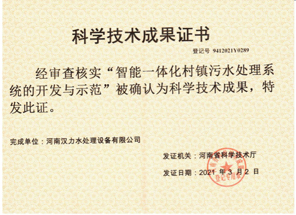 汉力“智能一体化村镇污水处理系统的开发与示范”荣获科技成果